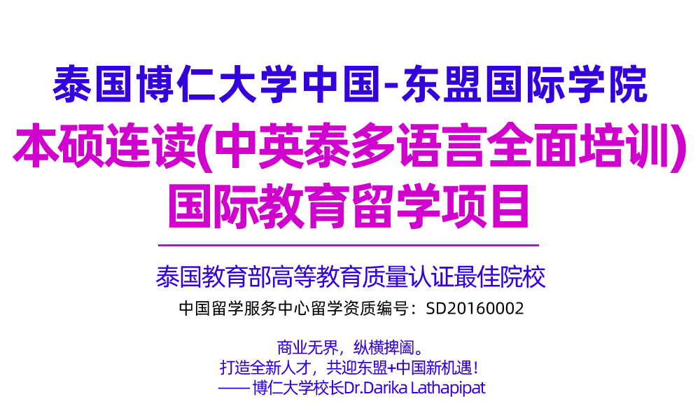 中国-东盟国际学院(简称CAIC)是博仁大学的直属学院,经泰国教育*批准,主要面向中国和东盟各国招收留学生。学院采用中英泰多语言全面培养,迅速成长为中国留学生留学泰国之首选,在读学生中也有很多准备来华留学的泰国籍学生。