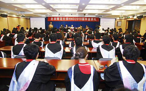 金声木铎,璀璨流年,告别青春,告别师大,三年时光匆匆而过,此去须怀报国志,不忘春风化雨情。北京师范大学英国高等教育文凭(HND)项目*一届毕业生将在这盛夏六月告别亲爱的母校,踏上他们海外留学的新征程。6月10日上午,北京师范大学  HND 2010届毕业典礼在北京师范大学京师大厦三层第六会议室隆重举行。