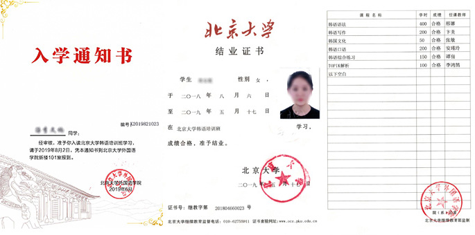 北京大学韩国留学班学生,属北京大学正规编制学生,配发北京大学统一的出入证、饭卡、图书证等;
