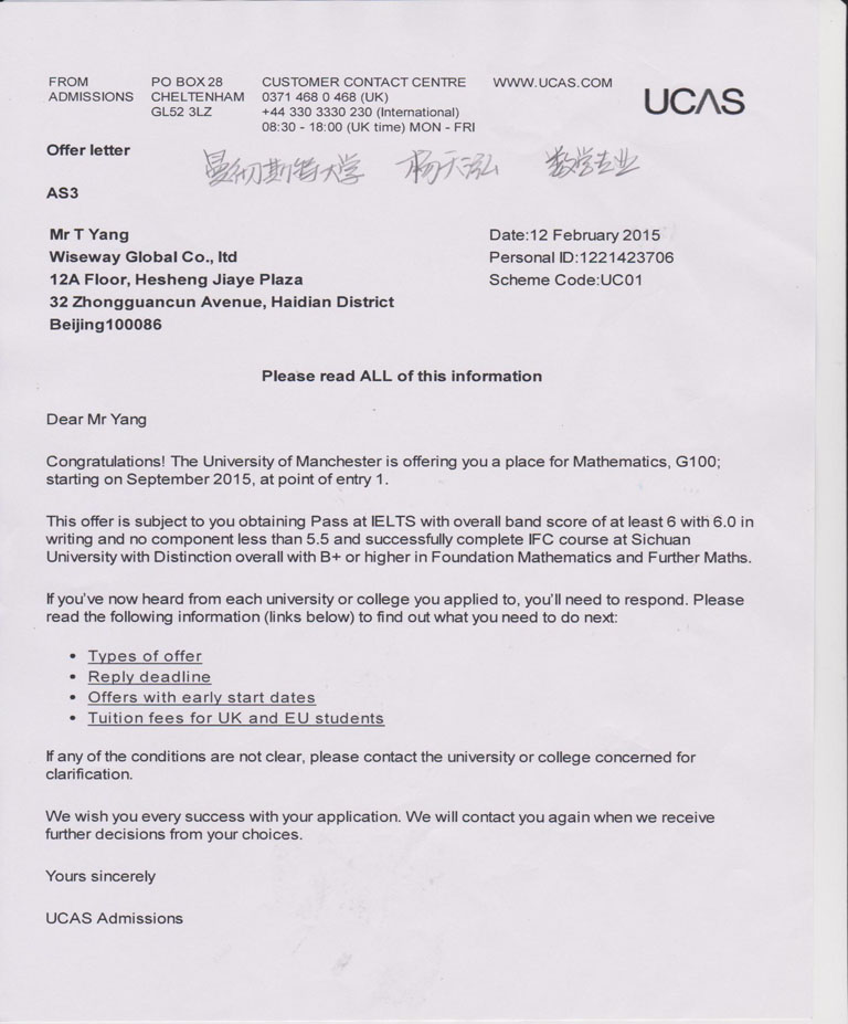 那么,雅思要求和专业课要求针对不同专业都是怎样的呢?今天就以今年毕业的2014届的四位将去曼彻斯特大学就读4个不同专业的同学的录取信为例来进行一一讲解: