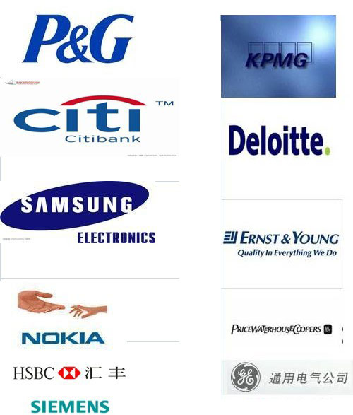 麦肯锡,埃森哲,法国兴业银行,荷兰银行,高盛,保洁,微软,强生,华为,施耐德电器,飞利浦以及四大国际会计师事务所(海外)。