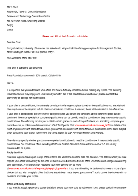 陈怡同学是我项目2013级学生,经过他在对外经贸大学信息学院出国留学预科班一年的学习提升,收获了英国莱斯特大学的OFFER。