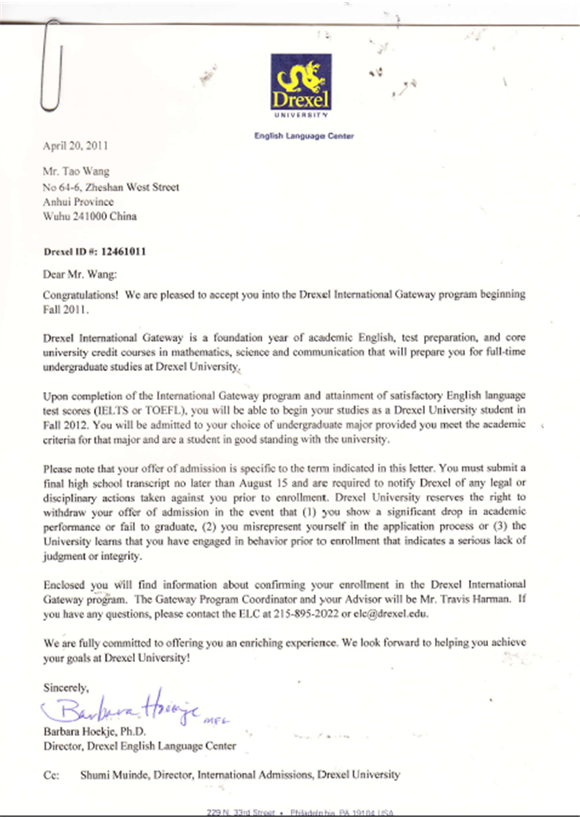王涛同学是我项目2010级学生,经过他在对外经贸大学信息学院出国留学预科班一年的学习提升,收获了美国德雷克赛尔大学的OFFER。